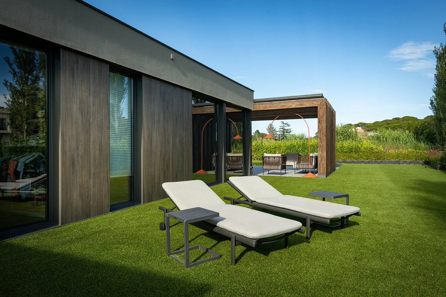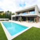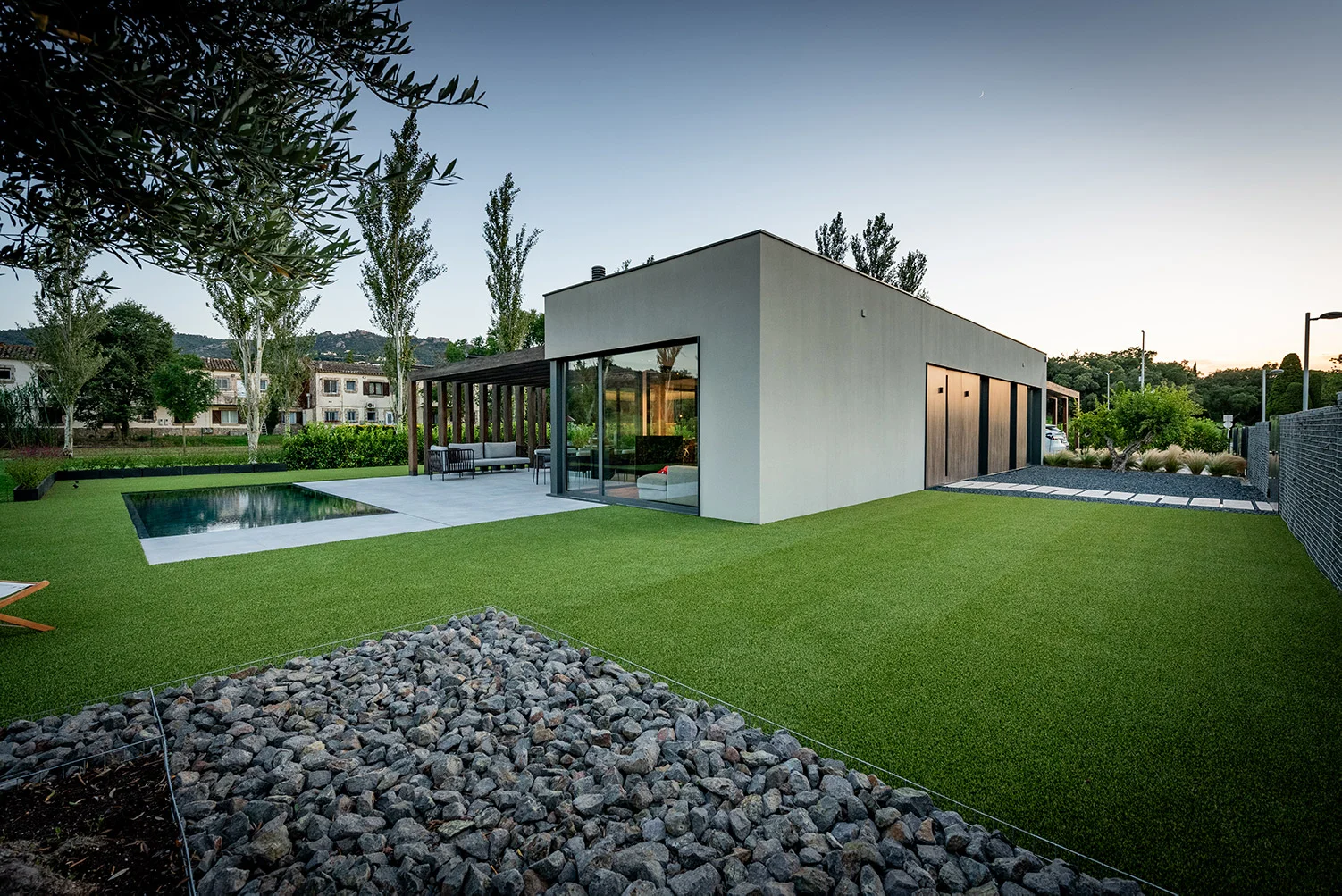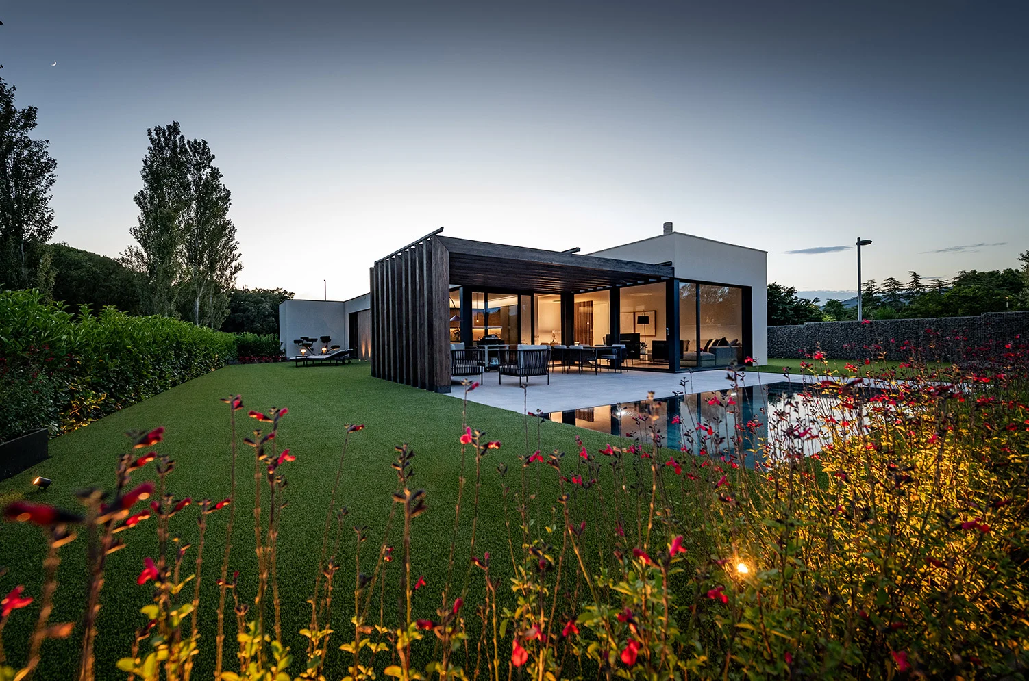 El diseño de la casa está formado por una amplia vivienda de dos módulos que generan las zonas de día y de noche y un módulo posterior en utilidad de trastero en la parte posterior. Presenta una zona de día (salón-cocina-comedor) con una zona acristalada muy generosa que proporcionan confort muy elevado para la vida del día a día. El diseño final se ve cumplimentada con un jardín extenso, una piscina, una terraza y dos porches que generan una casa muy moderna, atractiva y sobre todo muy funcional.